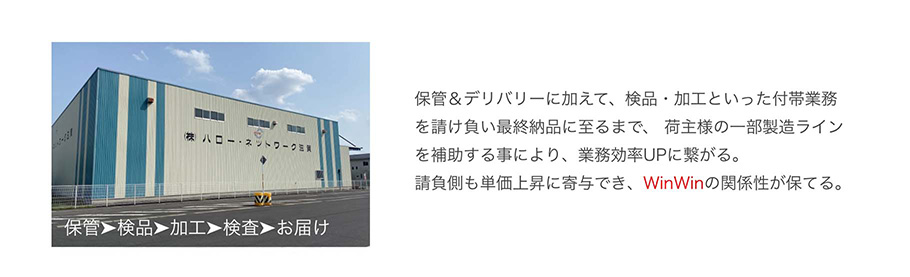 常に荷主様の目線に立って、流通加工業務を主体とし、最適な商品管理と輸送手段を導き出し、安全・確実な品質を遂行しています。